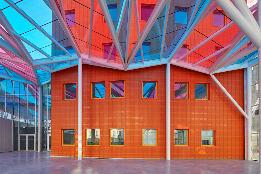 Spécificités projet : forte optimisation de l’enveloppe thermique en lien avec les exigences élevées du CPAUPE, raccordement des CTA amphithéâtre au puits canadiens des halles, gestion du confort d’été des salles de classes complétée par des CTA adiabatiques