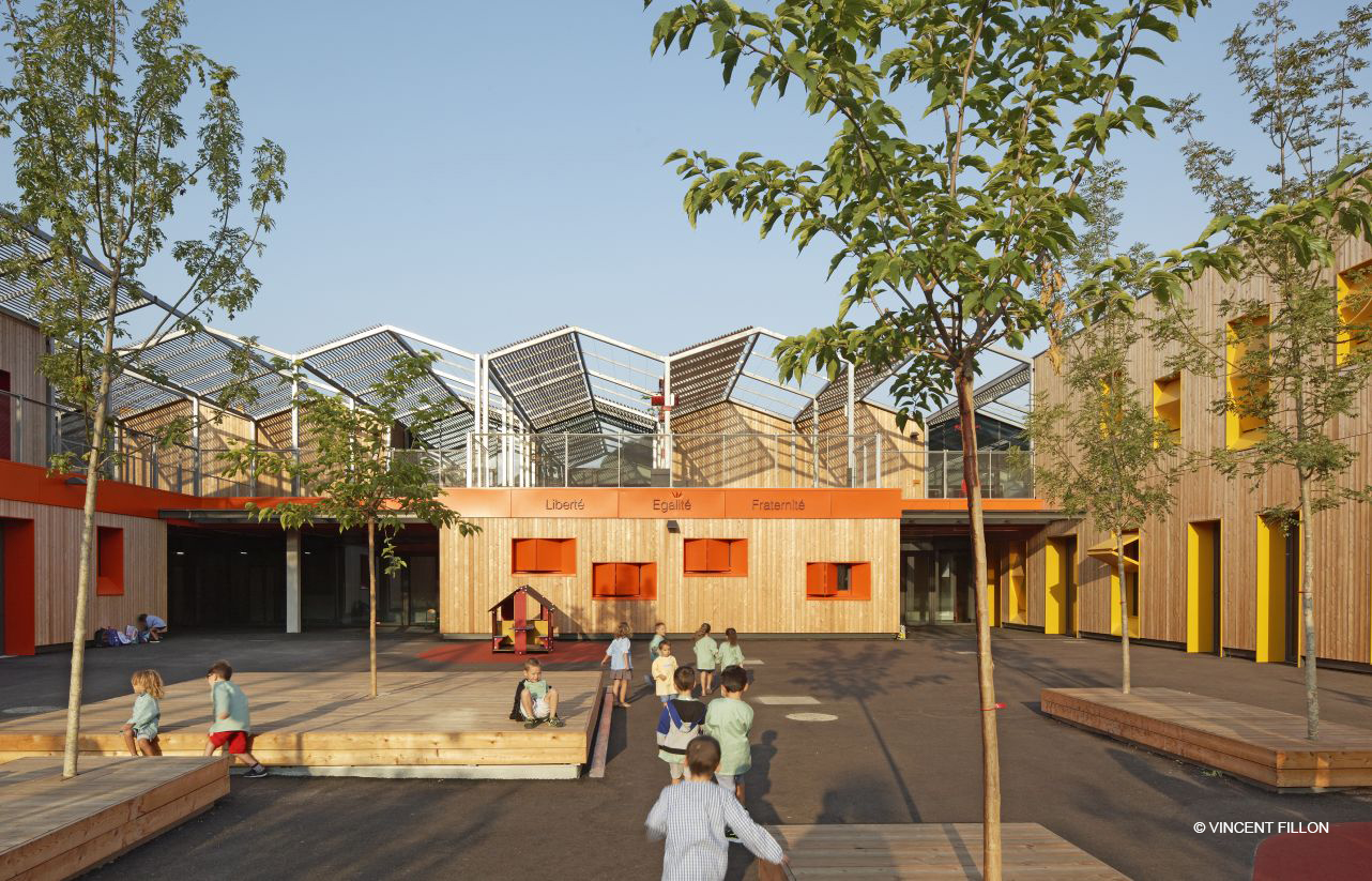 – Construction bois, bâtiment à énergie positive tout usage, premier groupe scolaire rafraichi par un échange direct sur eau de nappe sans mise en place d’un système thermodynamique.